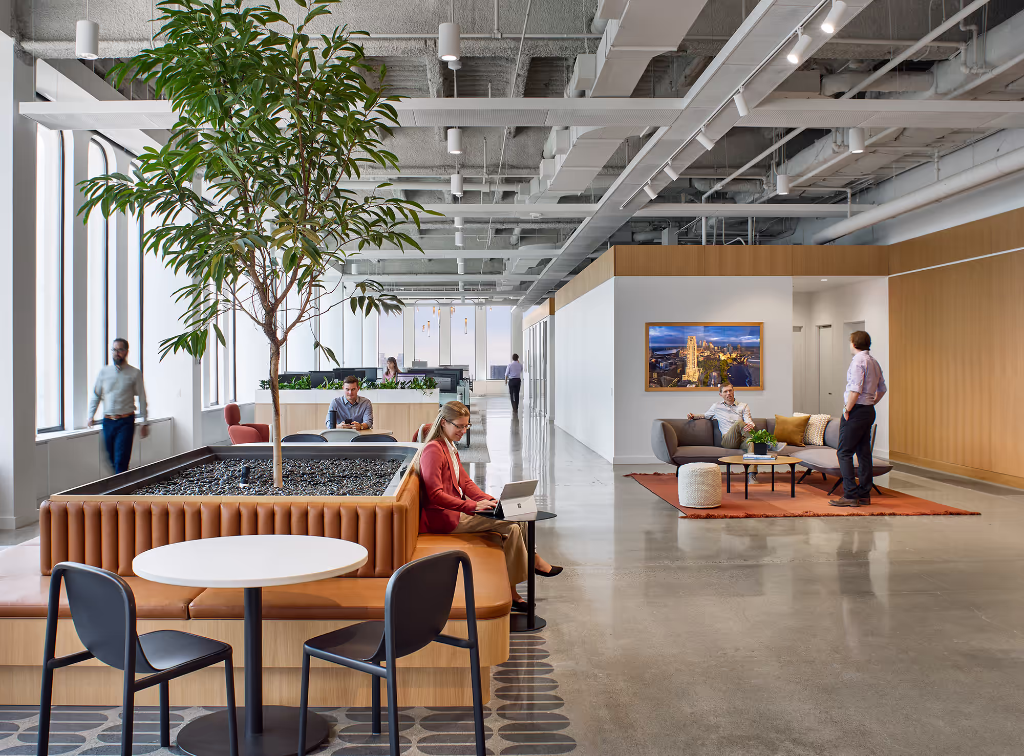 Greiner joined the project team after design development to deliver value-driven solutions that preserved the design vision while meeting budget goals. The renovation reimagined the top floor of RSM Plaza into a bright, modern workspace that highlights the building’s high ceilings and sweeping views. Key design features include a custom planter integrated with a leather banquette that creates an inviting open seating and collaborative work area. Polished concrete floors extend throughout, while floor-to-ceiling shelving elements define distinct zones without interrupting the open layout.